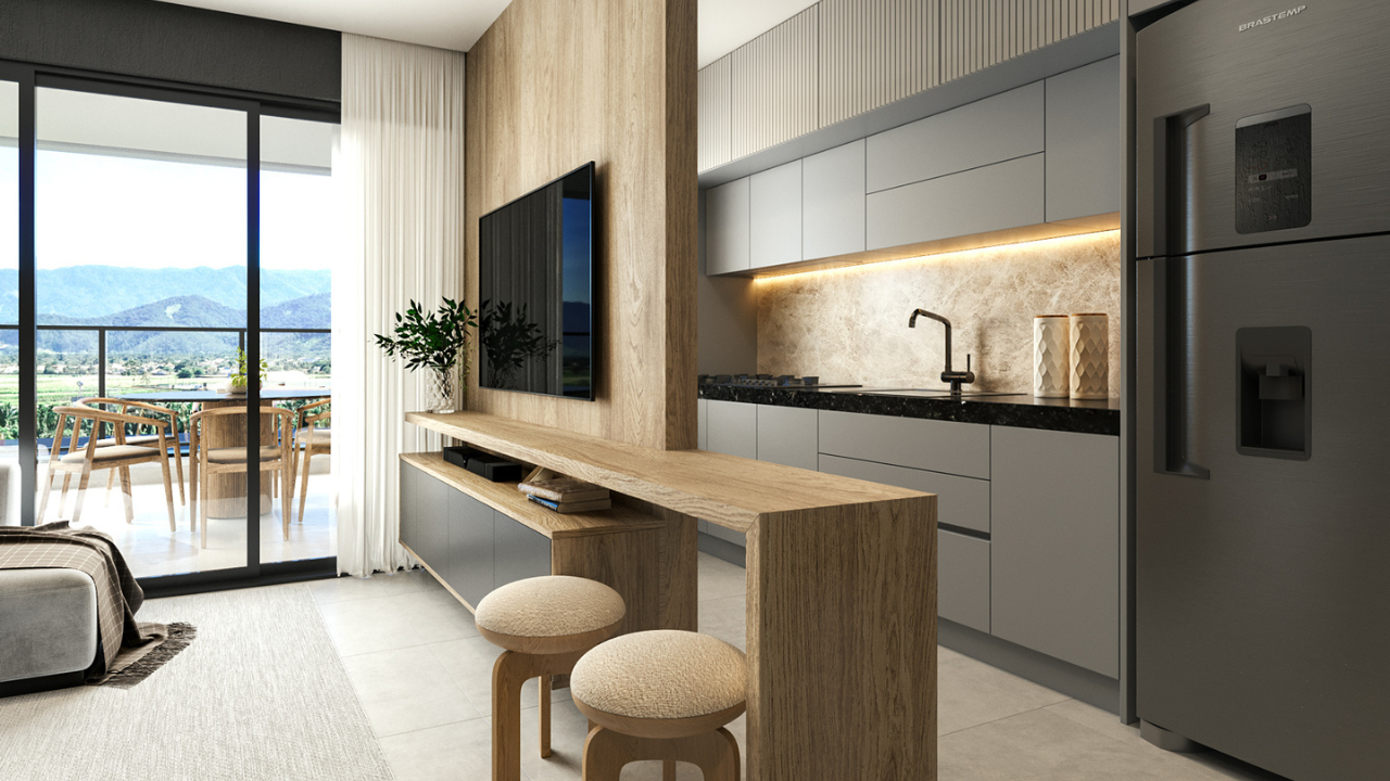 A vista 360º do Alpha Club oferece uma experiência imersiva que permite visualizar os ambientes e o entorno do empreendimento, com destaque para as perspectivas a partir do 6º andar dos blocos A e B. Essa visualização evidencia a localização privilegiada, a poucos metros da Praia do Indaiá, além da amplitude do projeto e da integração entre os espaços, ajudando o cliente a compreender melhor o panorama e a escolher a unidade ideal.